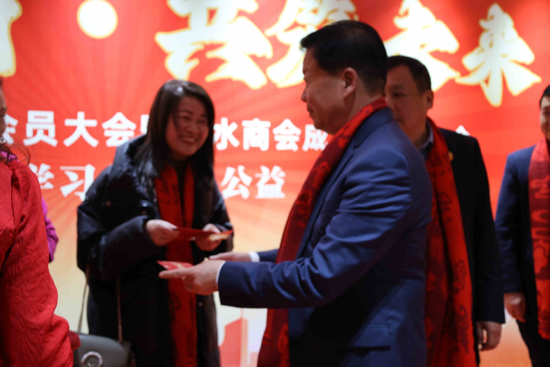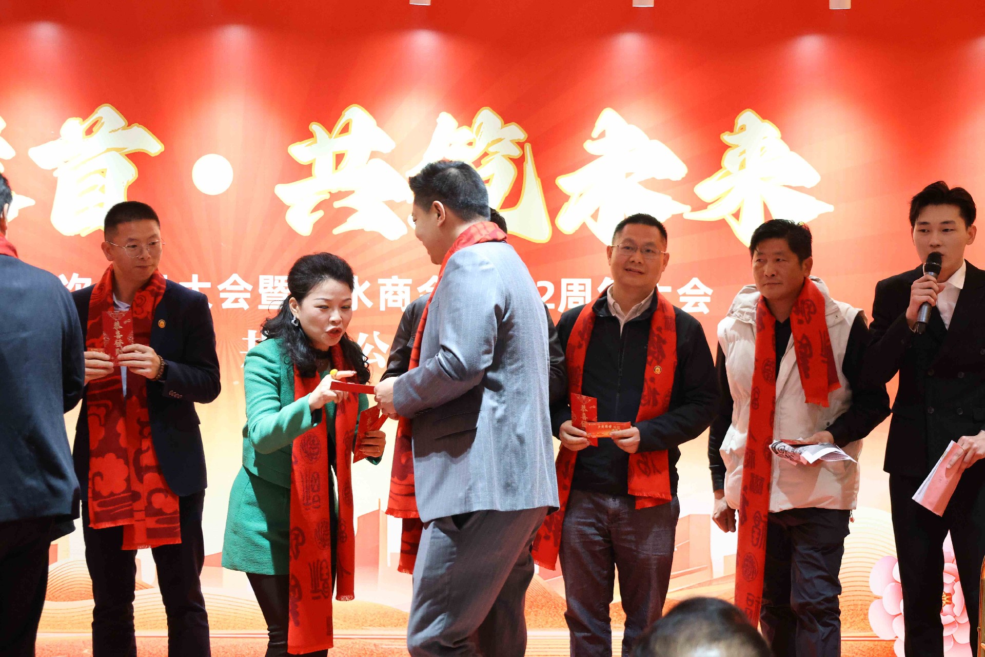 台下,数百位乡贤戴着统一的红围巾,认真聆听着会长的致辞。那些熟悉的乡音、相似的奋斗经历,让彼此的距离在这一刻悄然拉近。在随后的授牌仪式上,王茂青会长亲手将副秘书长的牌匾一一颁发给新晋成员,每一块牌匾的传递,都是一份责任的交接,更是商会组织建设的坚实一步。他与各位成员的合影定格在镜头里,红围巾的鲜亮与正装的沉稳相映成趣,勾勒出广水商人群体团结向上的精神面貌。